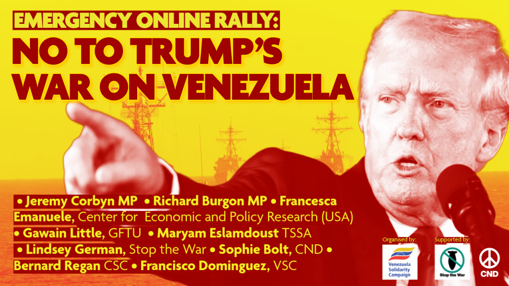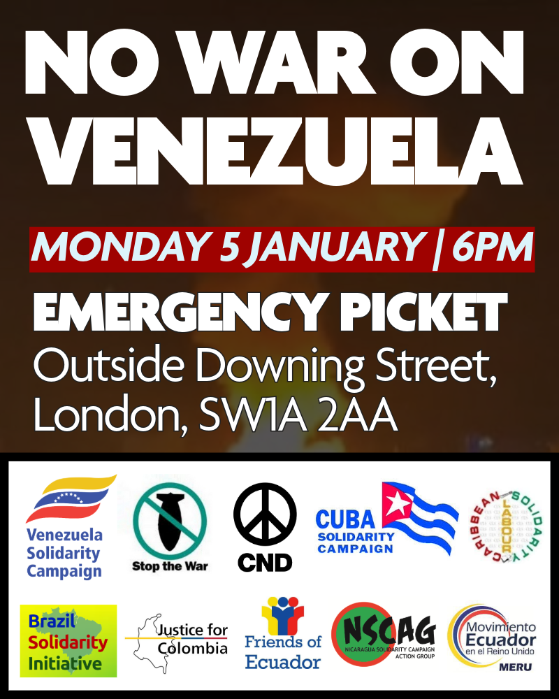 EMERGENCY PICKET Monday 5 Jan | 6PMOutside Downing Street, London, SW1A 2AA In the early hours of Saturday morning, Donald Trump ordered an illegal and dangerous military aggression against Venezuela, bombing large parts of Caracas and kidnapping Venezuela’s President Nicolás Maduro. This attack is wholly illegal and unjustified. It is a US regime-change operation against a sovereign …